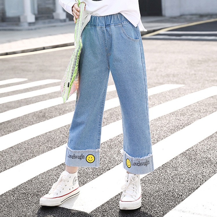 Girls Denim Wide Leg Pants Foreign Trade Children S Wear 2020 Autumn New Style Big Kids Smiley Loose Casual Jeans Shopee Indonesia