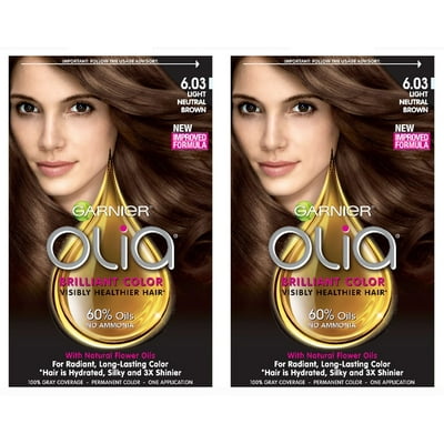 Garnier Olia Brilliant Color. Garnier Olia shade 603 Light Neutral Brown is a natural brown specially designed to balance warm and cool tones in your hair for the most neutral color results. Garnier Olia Permanent Haircolor Light Neutral Brown 6 03 1 ea.