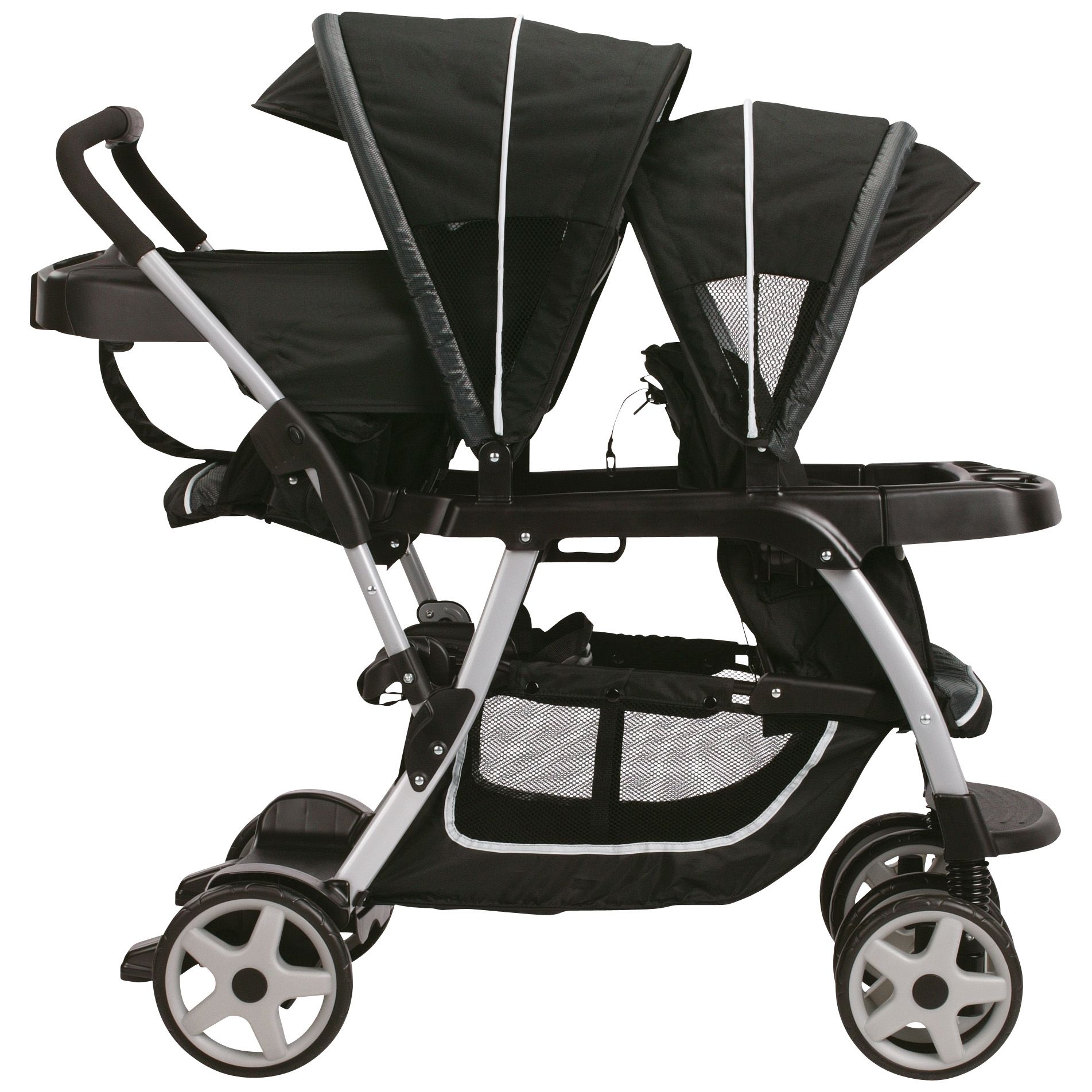 12 riding options for 2 children from infant to youth. The Ready2Grow Click Connect Double Stroller Gotham accepts Two Graco SnugRide Click Connect Infant Car Seats Americas 1 selling infant car seats has a standing platform and bench seat for your older child and a removable Face Time rear seat. Standard Width that Fits Anywhere First of all we like the fact that even though it was a double stroller it had stacked seating so it wouldnt present any problems getting in and out of doors.
